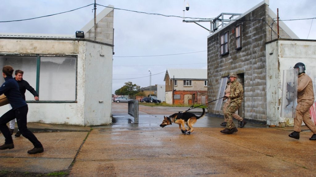 Bermuda’s soldiers today (THURS) worked with highly-trained British Army protection dogs as part of a major Royal Bermuda Regiment training exercise in the UK.